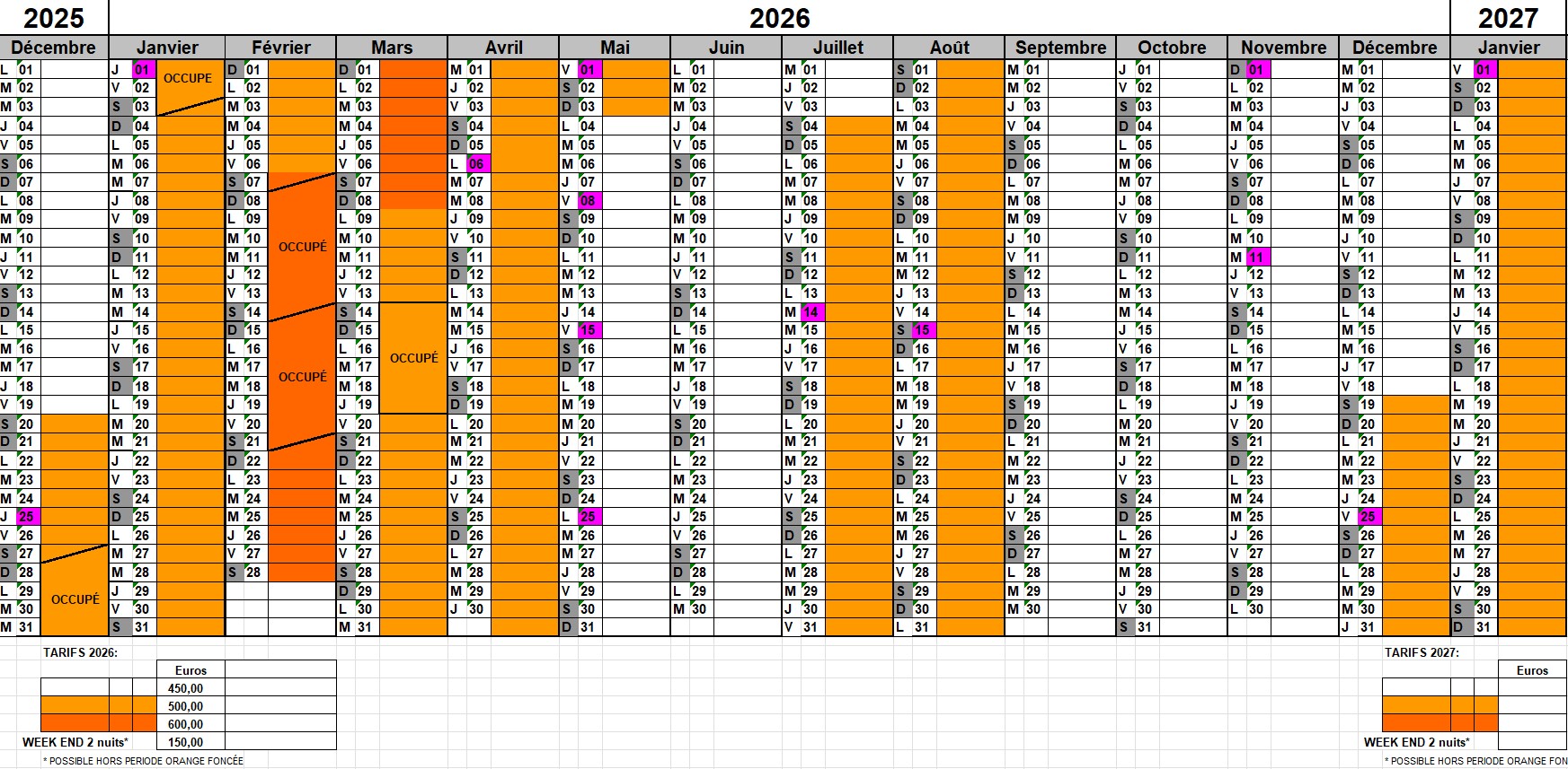 Horaires d'arrivée et de départ: Semaine complète, arrivée le samedi à partir de midi, départ le samedi avant 10h. Week-end, arrivée possible le vendredi soir, départ le dimanche soir. Autres nous consulter.