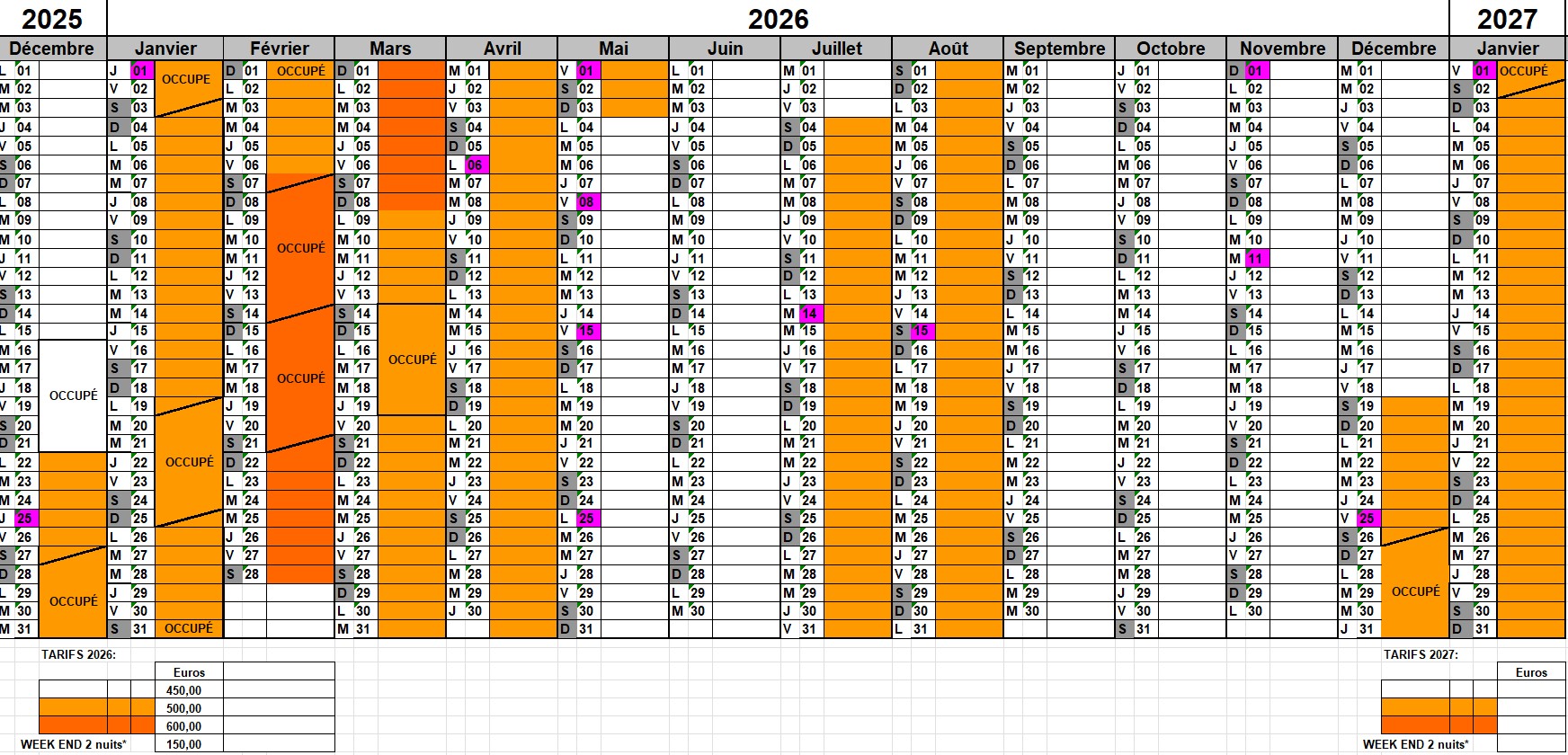 Horaires d'arrivée et de départ: Semaine complète, arrivée le samedi à partir de midi, départ le samedi avant 10h. Week-end, arrivée possible le vendredi soir, départ le dimanche soir. Autres nous consulter.